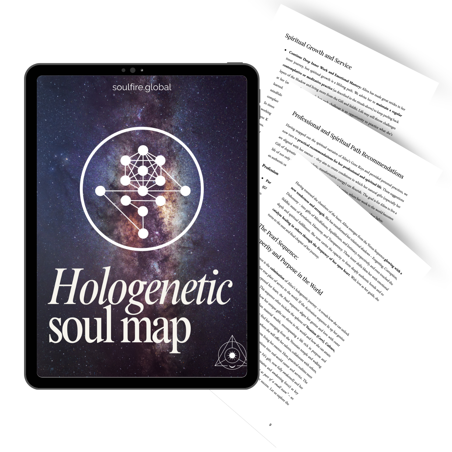 Transmission of your essence — a 40-page personalized document decoding your shadows, gifts, and highest potential. Each page mirrors your evolutionary journey, illuminating the exact frequencies you are here to embody and the patterns ready to dissolve.